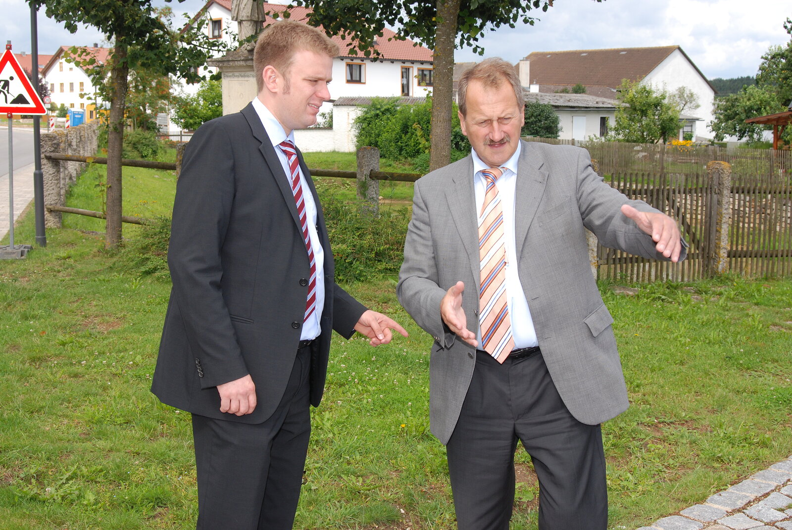 Ökologie, Wasserschutz und Dorferneuerung, das waren die Themen, die Bürgermeister Ludwig Mayinger bei dem Informationsbesuch des CSU-Bundestagskandidaten Dr. Reinhard Brandl in Schernfeld an praktischen Beispielen darlegte. So demonstrierte er anhand der laufenden Neugestaltung des Ortskerns in Schönfeld, einem Ortsteil von Schernfeld, wie die Neugestaltung von Dorfkernen auch die Anwohner bewegt – praktisch alle Anlieger am Dorfanger, übernähmen die Gestaltungsvorschläge mit Gittersteinen und extra breiter Rasenwachstumsfuge für ihre Hofzu- und -einfahrten, und das auf eigene Kosten. Auch der Dorfweiher wird in Kürze neu gestaltet und so angelegt, dass er nicht nur Wasserreservoir, sondern auch Wasserreinigungsanlage sei. Überhaupt sei Wasser ein Thema, das besonders auf kommunaler Ebene noch stärker Beachtung finden müsse. Dem stimmte Brandl zu, immerhin „ist Wasser die wichtigste und zukunftsträchtigste Ressource, die wir haben.“