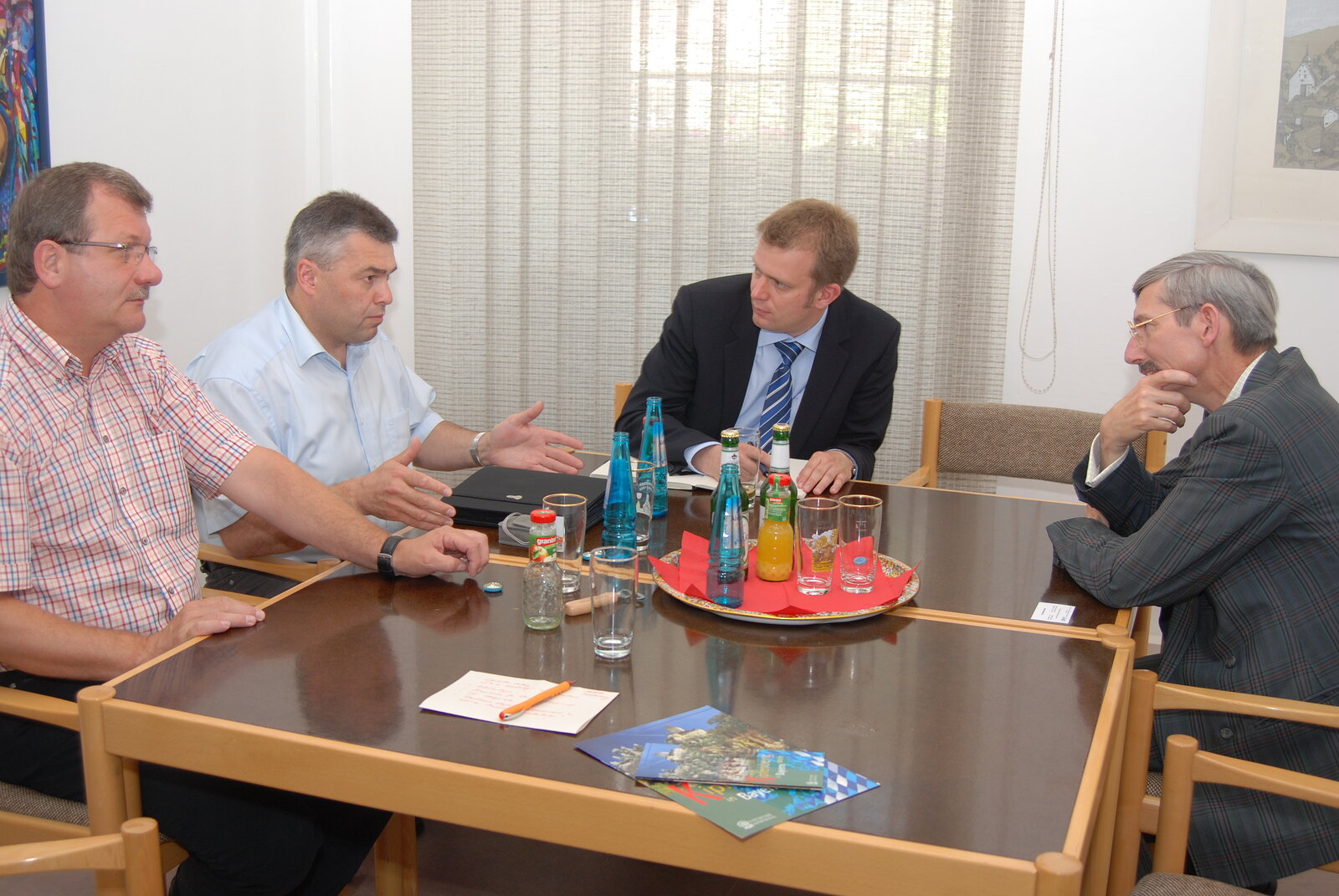 Im Kipfenberger Rathaus traf der CSU-Bundestagskandidat Reinhard Brandl zum Informationsgespräch mit dem Bürgermeister Rainer Richter und Vertretern der CSU-Fraktion, CSU-Ortsvorsitzendem Hubert Albrecht und Marktrat Willi Krieglmeier, zusammen. Bei stagnierenden Einwohnerzahlen und schwieriger Tourismussituation ist die Zukunft des idyllischen Marktes im Altmühltal angespannt. Hinzu kommt, dass die Ausweisung von neuen Gewerbegebieten aufgrund der Tallage erheblich eingeschränkt ist. Dennoch arbeiten die Kommunalpolitiker kontinuierlich an der Weiterentwicklung Kipfenbergs. So werden Baugebiete ausgewiesen und Infrastrukturen modernisiert, gastronomische und touristische Einrichtungen fortentwickelt. Im Schatten der Kipfenberger Burg konnte sich Reinhard Brandl in dem Gespräch ein umfassendes Bild über die Kommune machen und stellte in Aussicht, in allen politischen Bereichen gerne weiter zu helfen.
