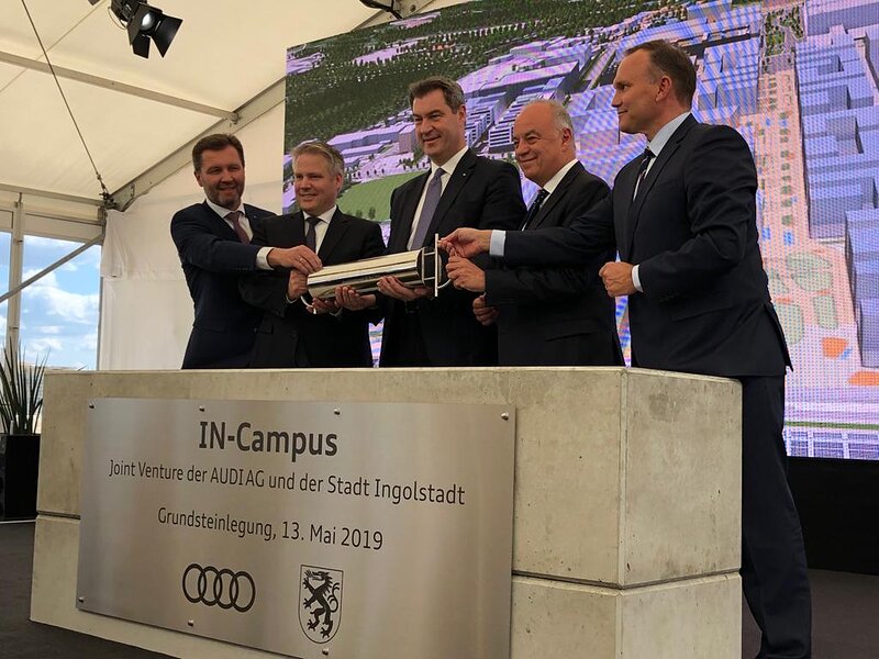 Ministerpräsident Dr. Markus Söder ließ es sich nicht nehmen, bei der Grundsteinlegung für den IN-Campus auf dem Gelände der ehemaligen Eriag-Raffinerie dabei zu sein. Auf dem 75 ha großen Gelände wird ein Technologiepark für hochqualifizierte Experten entstehen und Ingolstadt tausende neue Arbeitsplätze bringen. Die AUDI AG wird zunächst sehr viel Geld in die Hand nehmen müssen, um das kontaminierte Grundstück zu sanieren. Als "ziemlich cooles Projekt" bezeichnete Miniserpräsident Markus Söder das Vorhaben. Mit AUDI-Entwicklunsvorstand Peter Kössler und Oberbürgermeister Dr. Christian Lösel füllte er die Zeitkapsel für den Grundstein mit allerlei Erinnerungsstücken. Den ersten Teil des Projekts will AUDI bis 2023 realisieren.