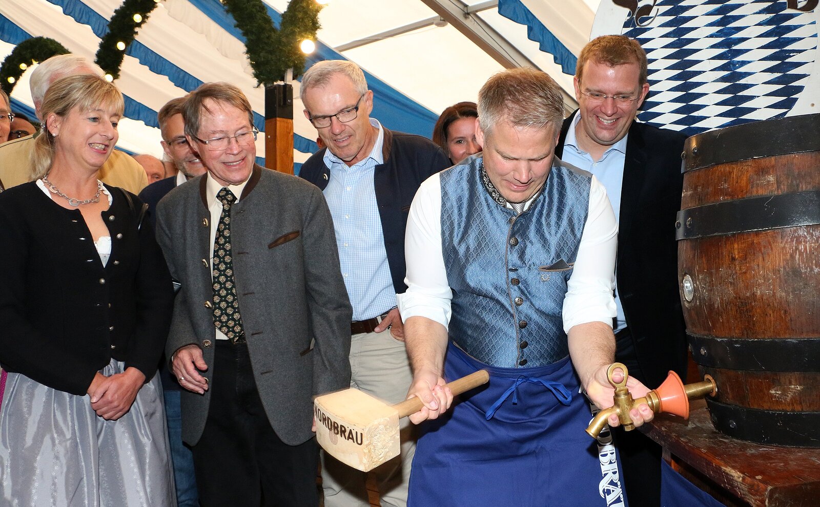 Nach dem Standkonzert vor dem Festzelt zapfte Oberbürgermeister Dr. Christian Lösel mit nur zwei Schlägen das erste Fass Bier an und eröffnete das Ingolstädter Herbstfest. Im Beisein von Nordbräu-Chefin Eva Wittmann-Ott, Alt-Oberbürgermeister Peter Schnell und Dr. Reinhard Brandl MdB sowie vielen Stadträten wünschte der Oberbürgermeister eine friedliche Wies'n und allen Gästen einen schönen Aufenthalt.