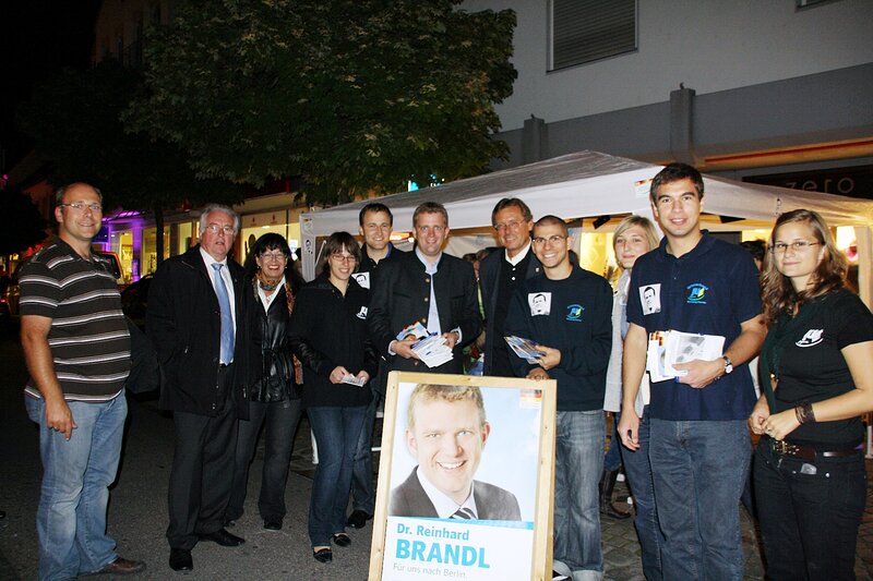 Die JU Neuburg hat zum Wahlkampfendspurt nochmal alles gegeben: Am Freitag Abend fand in Neuburg, passend zum Late-Night-Shopping, ein Nachtinfostand statt. Bei Kaffee und Sekt konnten sich die Nachtschwärmer letzte Infos zur Bundestagswahl holen. Der Bundestagskandidat Dr. Reinhard Brandl warb persönlich bis um Mitternacht um das Vertrauen der Bürger und wurde dabei nicht nur von "seiner" JU, sondern auch vom Neuburger Oberbürgermeister Dr. Bernhard Gmehling und zahlreichen Mitgliedern des Stadtrates unterstützt. Die Neuburger JU sprach vor allem der Familie Habermayr, Ihnaber des gleichnamigen Spielwarengeschäfts, ein großes Dankeschön für die wiederholte Unterstützung des Standes aus. Nachdem gegen 1:00 Uhr alles aufgeräumt war, legte die JU bereits um 9:00 Uhr wieder los und unterstütze die drei Infostände der CSU im Stadtgebiet mit 6 Teilnehmern. Auch die letzten Stunden vor dem Urnengang werden politisch: Auf der Erstwählerparty der Jungen Union im Überlauf (www.überlauf-neuburg.de) wird gemeinsam in den Wahltag hinein gefeiert.
