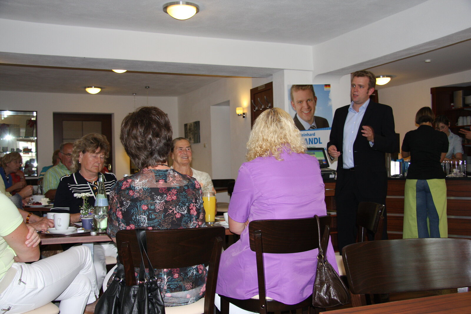 Politiker müssen auf die Menschen zugehen! Diese Maxime nahm sich der junge CSU-Bundestagskandidat Dr. Reinhard Brandl zu Herzen und setzte sie im Rahmen des Kaffeekränzchens der Frauen Union Kipfenberg in die Tat um. Reinhard Brandl war der Einladung der FU-Ortsvorsitzenden Christa Blechinger am Montagnachmittag in das neu eröffnete, mitten im Marktplatz gelegene, Cafe Bauer gefolgt und drehte damit den Spieß einmal um: Die politisch interessierten Frauen durften und sollten reden, während der für alle Fragen offene Bundestagskandidat Rede und Antwort stand. Nach einer kurzen Vorstellung seiner Person stellte Dr. Reinhard Brandl den Frauen seine politischen Tätigkeiten, seine Ziele sowie Ansichten, beispielsweise die Konsolidierung der Staatsfinanzen, die Stärkung des ländlichen Raums und das Miteinander der Generationen, vor. Danach widmete er sich in persönlichen Gesprächen bei Kaffee und Kuchen den alltäglichen Problemen, Interessen und Anregungen des weiblichen Geschlechts. Die sehr gute Besucherzahl des Kaffeekränzchens sprach für Dr. Reinhard Brandl, der durch seinen Besuch die Chance bestens genutzt hat, den Mitgliedern der FU zu vermitteln, wie vielfältig und komplex politische Entscheidungsprozesse sind. Denn nur wer nachvollziehen kann, wie Politik funktioniert, übernimmt auch zukünftig Verantwortung, geht wählen und engagiert sich.