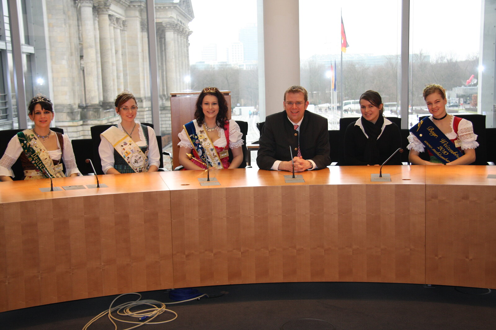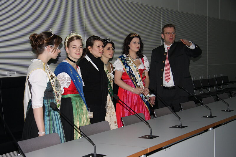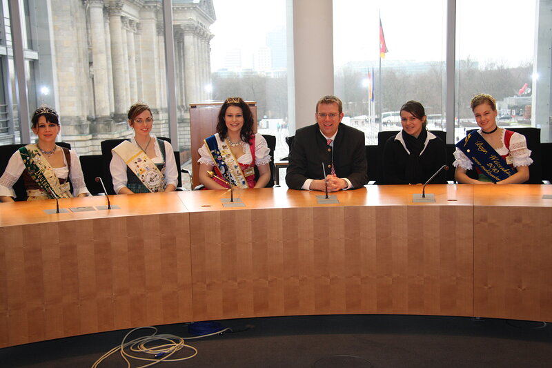 Hohen Besuch erhielt MdB Dr. Reinhard Brandl in Berlin - Anlässlich der Grünen Woche waren die Deutsche Zuckerrübenkönigin Christina Rominger, die Bayerische Weizenkönigin Katharina Büchl, die Schrobenhausener Spargelkönigin Monika Schweiger, die Bayerische Maikönigin Sabrina Isele sowie die Evi Haage in Berlin. Reinhard Brandl zeigte den Majestäten seinen Berliner Arbeitsplatz und ließ es sich nicht nehmen, die Damen persönlich durch den Reichstag zu führen. Neben dem Plenarsaal durften die Majestäten auch einen Blick in den Fraktionssaal werfen. Dort erläuterte er ihnen den Ablauf einer Sitzungswoche im Deutschen Bundestag. Nach einem zweistündigen Programm verabschiedete er die Majestäten, die wieder ihren Pflichten bei der Grünen Woche nachkommen mussten.