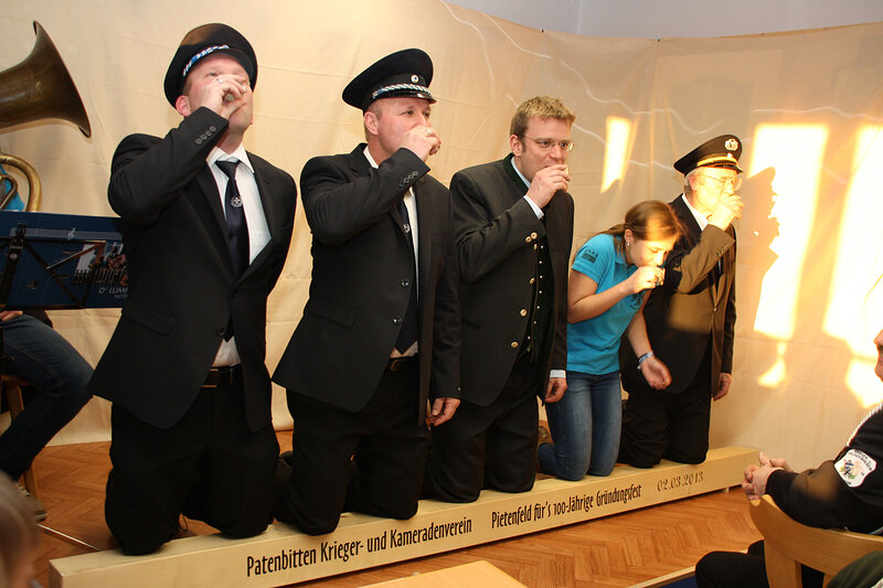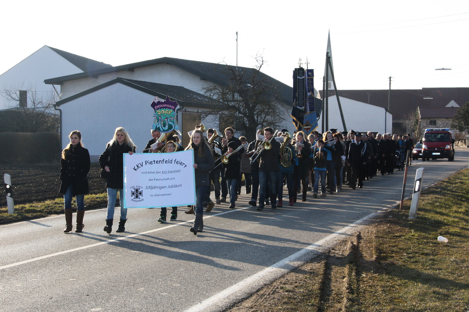 Der Krieger- und Kameradenverein Pietenfeld feiert vom 24. bis 26. Mai 2013 sein 100-jähriges Gründungsjubiläum. Der Jubelverein kam zum Krieger- und Soldatenverein Eitensheim, um dort die Patenschaft zu erbitten. Mit Blasmusik wurde der Schirmherr, MdB Dr. Reinhard Brandl, abgeholt und unter Beteiligung der beiden Vereine zum Patenbitten im Feuerwehrhaus begleitet. Bis sich die Eitensheimer bereits erklärten, die Patenschaft zu übernhmen, mussten die Pietenfelder Kameraden einige Hürden nehmen. Auch der Schirmherr blieb davon nicht verschont. Letztendlich hat dann der Krieger- und Soldatenverein Eitensheim mit großer Freude die Übernahme der Patenschaft zugesichert. Mit einem netten Fest wurde dieser formale Akt dann besiegelt.