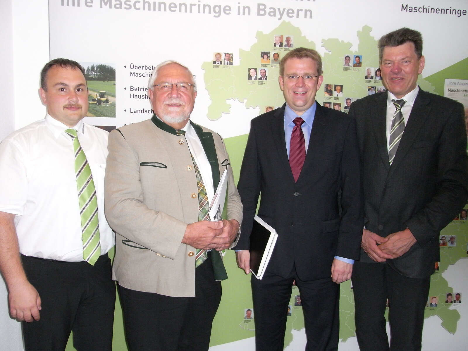 Zusammen mit dem Wahlkreisabgeordneten Dr. Reinhard Brandl besuchte der agrarpolitische Sprecher der CSU-Landesgruppe im Deutschen Bundestag, Dr. Max Lehmer, die Geschäftsstelle des Kuratoriums Bayerischer Maschinen- und Betriebshilferinge e. V. in Neuburg. Im Gespräch mit dem Geschäftsführer Georg Thalhammer und mit Martin Gehring diskutierten die beiden Abgeordneten aktuelle politische Fragen. Zentrale Themen waren die nebenberufliche landwirtschaftliche Betriebshilfe, Arbeitszeitregelungen, die Anpassung der Straßenverkehrs-Zulassungs-Ordnung an den technischen Fortschritt sowie Möglichkeiten zur Verbesserung der Akzeptanz der Landwirtschaft bei der örtlichen Bevölkerung.