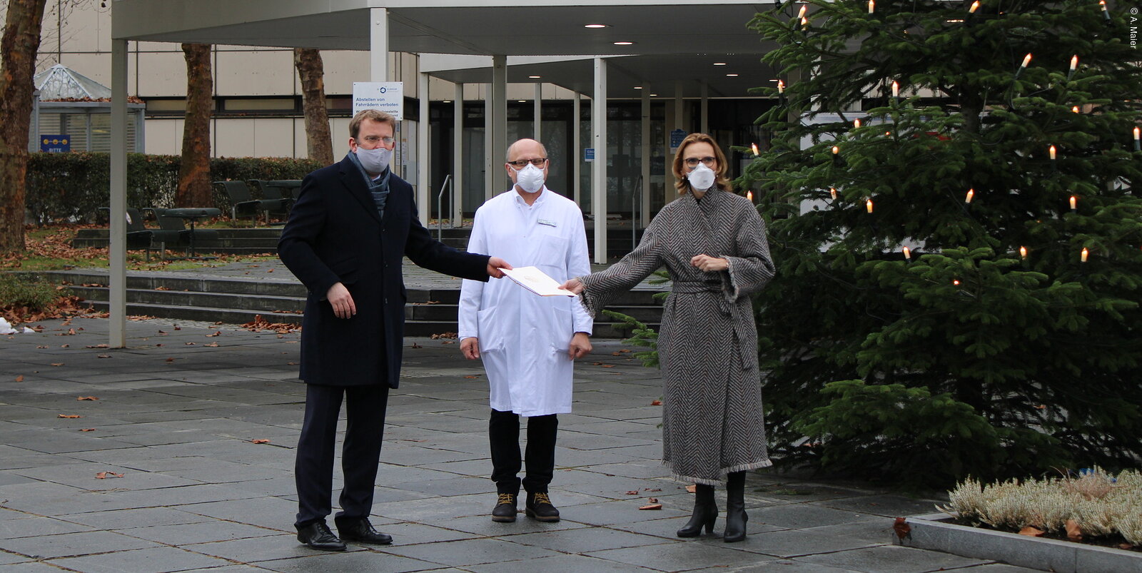 Dr. Reinhard Brandl überreichte den Förderbescheid an die Geschäftsführerin Monika Röther und Dr. Peter Linhardt, Leiter der hauseigenen Apotheke am Klinikum.