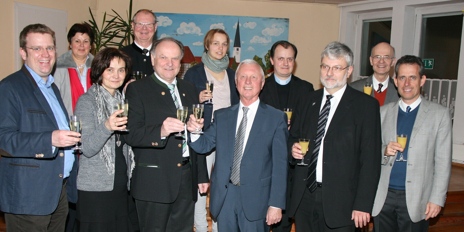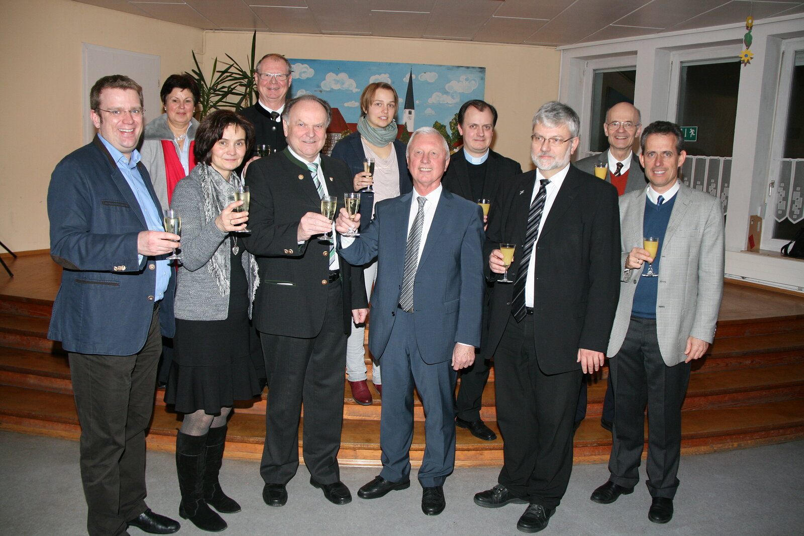 Auf ein gutes neues Jahr stießen beim traditionellen Neujahrsempfang der kirchlichen und politischen Gemeinde Eitensheim an: v.l. Bundestagsabgeordneter Dr. Reinhard Brandl, Dorothee Holl, pastorale Mitarbeiterin aus Buxheim, Pfarrgemeinderatsvorsitzende Ingrid Sangl, Bürgermeister Michael Stampfer, Gemeindeassistentin Stephanie Maurer, 2.Bürgermeister des Marktes Gaimersheim Günther Bernhardt, Kaplan Karsten Junk, Pfarrer Michael Konecny sowie Pfarrer Dr. Christian Weitnauer und Pfarrer Ulrich Eckert von der evang.-luth. Kirchengemeinde Gaimersheim. Zuvor fand ein ökumenischer Gottesdienst unter der Jahreslosung „Nehmt einander an, wie Christus euch angenommen“ statt, der von der Kantorei Gaimersheim sowie Sieglinde Kommer (Orgel) und Herbert Hammerer (Trompete) musikalisch umrahmt wurde. Mit Köstlichkeiten vom Buffet und guten Gesprächen ließen die zahlreich erschienenen Anwesenden den Abend ausklingen.