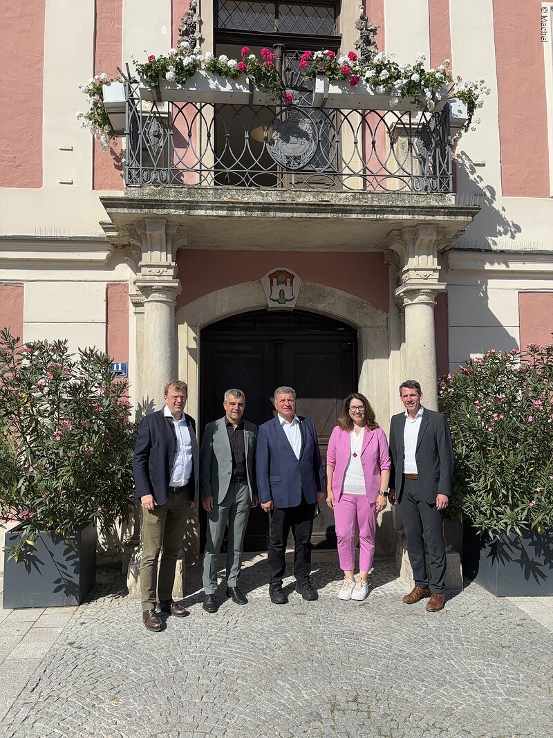 Hochkarätige Runde im Eichstätter Rathaus: Zu einem Arbeitsgespräch über den ÖPNV in der Region konnte Oberbürgermeister Grienberger Bayerns Verkehrsminister Christian Bernreiter begrüßen. Auch die Abgeordneten Reinhard Brandl und Tanja Schorer Dremel waren zugegen. Landrat Alexander Anetsberger komplettierte die Runde.