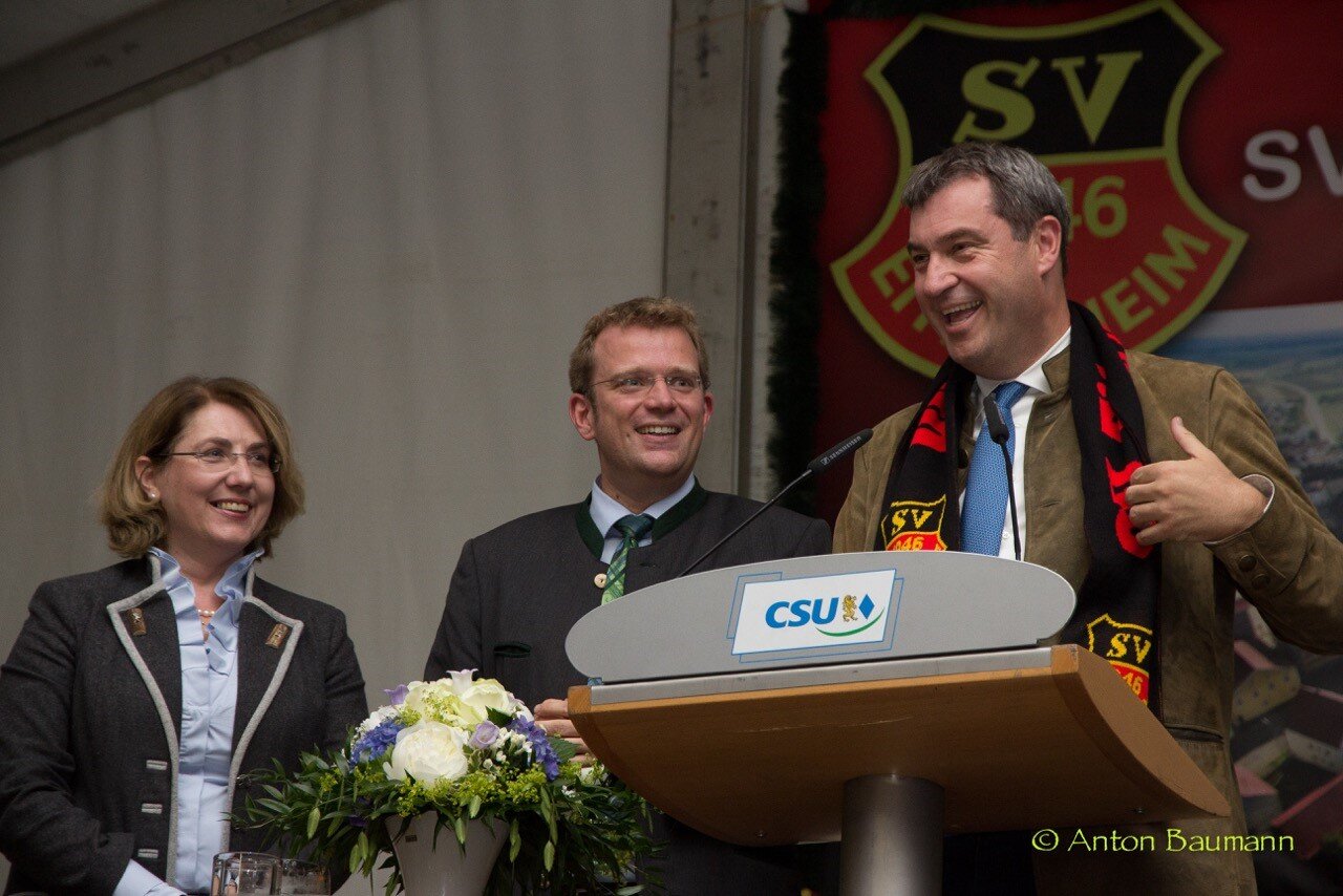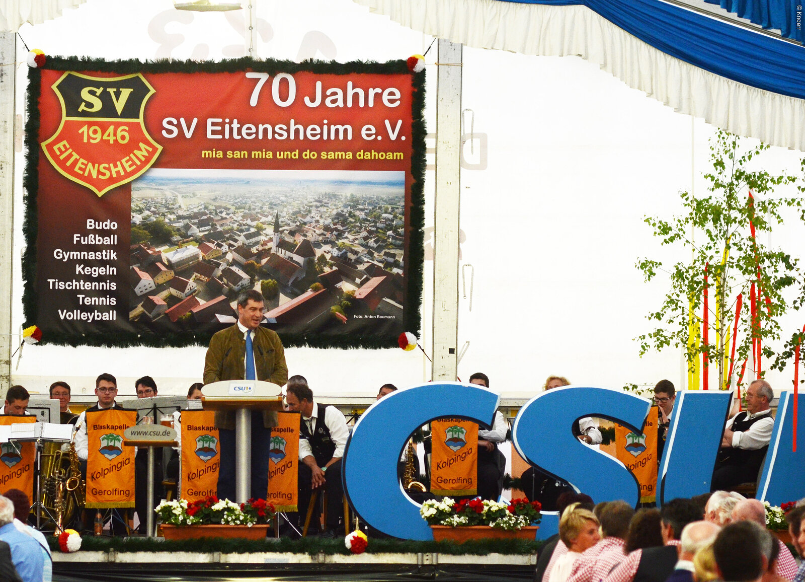 Zum Auftakt der Feierlichkeiten anlässlich des 70jährigen Bestehens des SV Eitensheim kam auf Einladung des örtlichen Bundestagsabgeordneten Dr. Reinhard Brandl der Bayerische Staatsminister der Finanzen, Markus Söder, nach Eitensheim. Unter den über Eintausend Gästen konnte Reinhard Brandl neben dem Ehrengast auch MdL Tanja Schorer-Dremel, Landrat Anton Knapp, Bezirksrat Reinhard Eichiner und Bürgermeister Michael Stampfer sowie Parteifreunde aus dem gesamten Landkreis begrüßen. Er beglückwünschte den Jubelverein SV Eitensheim und bat Staatsminister Markus Söder um seine Festrede.