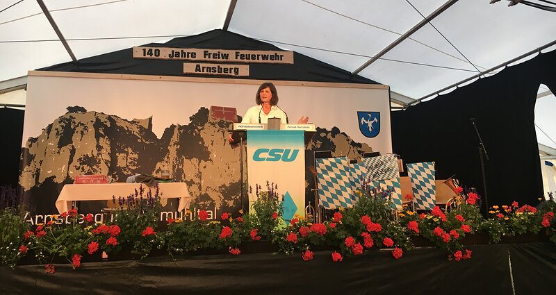 Zum politischen Abend anlässlich des 140-jährigen Bestehens der Freiwilligen Feuerwehr Arnsberg war Staatsministerin Ilse Aigner gekommen. Die stellvertretende Ministerpräsidentin gratulierte der FFW Arnsberg zu ihrem stolzen Jubiläum und lobte das ehrenamtlich Engagement. Das Betätigungsfeld der Feuerwehren hat sich in den letzten Jahren sehr verändert. Es gehe bei weitem nicht mehr nur um Löscheinsätze, vor allem haben die Wehren in jüngster Zeit mit zu viel Wasser zu kämpfen, so Ilse Aigner. In ihrer Rede ging sie auch auf die Flüchtlingsproblematik, die Erbschaftssteuer und die Lage der bayerischen Wirtschaft ein. Das sehr zahlreiche Publikum bedankte sich bei Frau Aigner mit lang anhaltendem Beifall. Staatsministerin Aigner wurde von MdB Dr. Reinhard Brandl, MdL Tanja Schorer-Dremel, Bezirksrat Reinhard Eichiner und Landrat Anton Knapp begleitet.