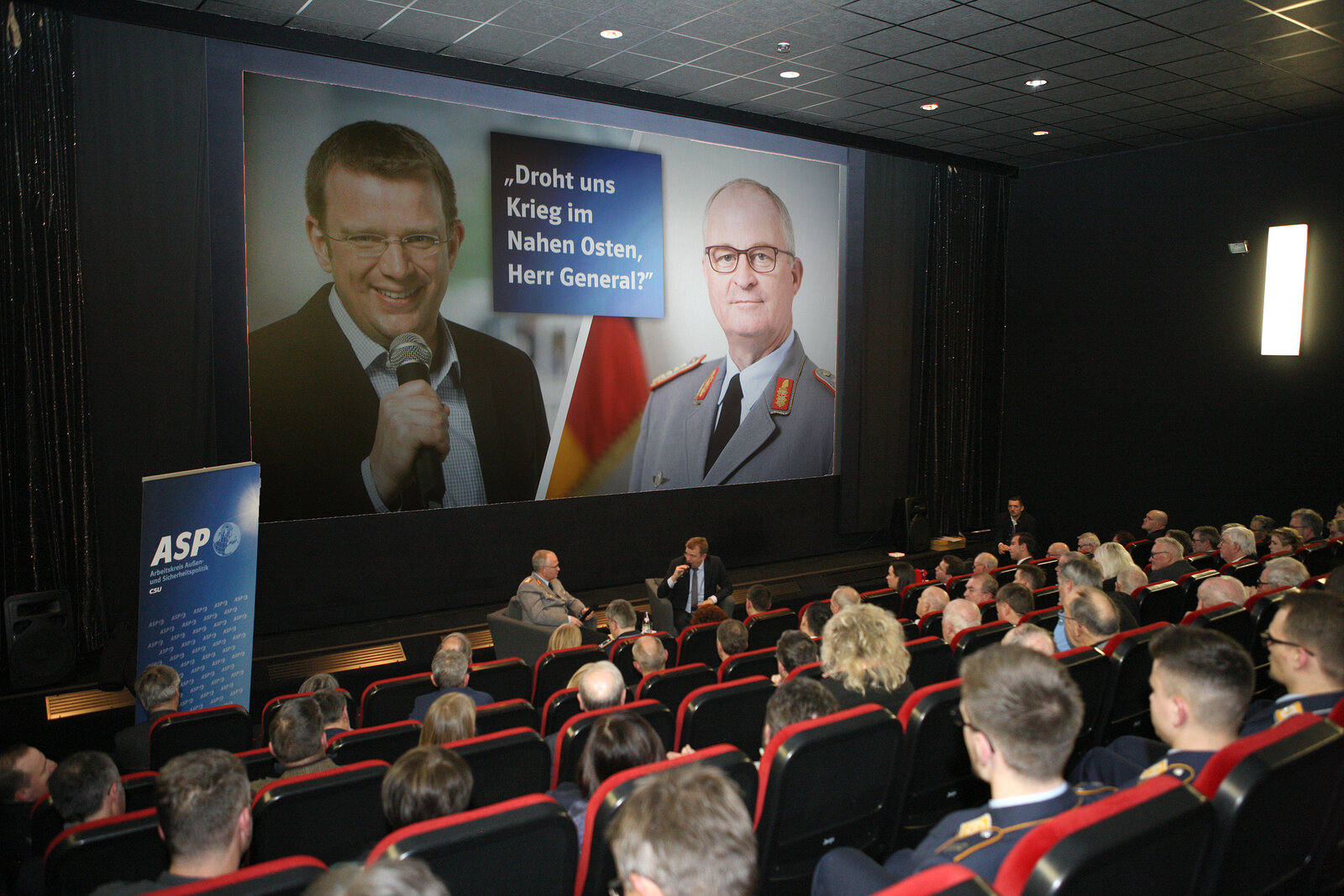 Eine ungewöhnliche Location für einen außergewöhnlichen Gast: Unter dem Thema "Droht uns Krieg im Nahen Osten" traf sich Dr. Reinhard Brandl zum Gespräch mit dem Generalinspekteur der Bundeswehr, Herrn General Eberhard Zorn. Veranstaltungsort war der voll besetzte Kinosaal in Neuburg.