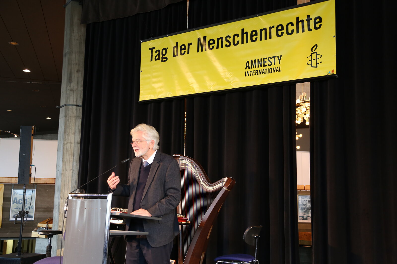 Bereits zum 20. Mal hatte die Ingolstädter Amnesty International-Gruppe zum Tag der Menschenrechte eingeladen. Eine sehr große Besucherschar war gekommen, um den Vortrag des Gastredners zu hören. Der Soziologe und Theologe, Jürgen Miksch, unter anderem Mitbegründer von Pro Asyl sowie des Bayerischen Flüchtlingsrates sprach über die Situation der Flüchtlinge weltweit. Rund 1,2 Prozent der Weltbevölkerung seien auf der Flucht, und das habe viele Ursachen: durch Kriege, Hunger, Armut, Klimaerwärmung oder die Überfischung der Meere verlieren Tausende ihre Lebensgrundlage und werden dadurch zur Flucht gezwungen, so Miksch. Die Flüchtlingsthematik ist Jürgen Micksch zufolge eine "Jahrhundertaufgabe".