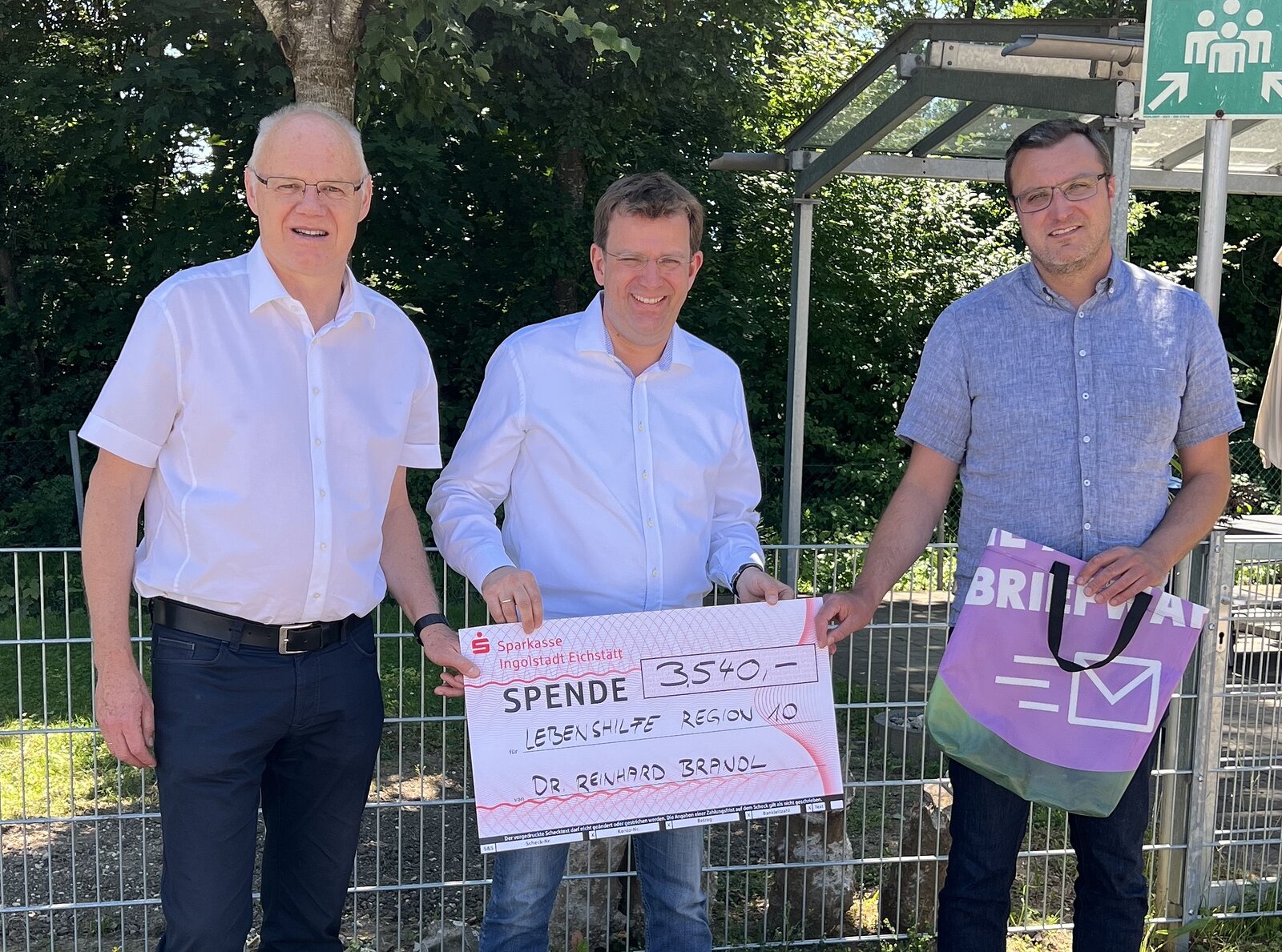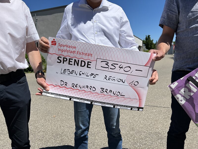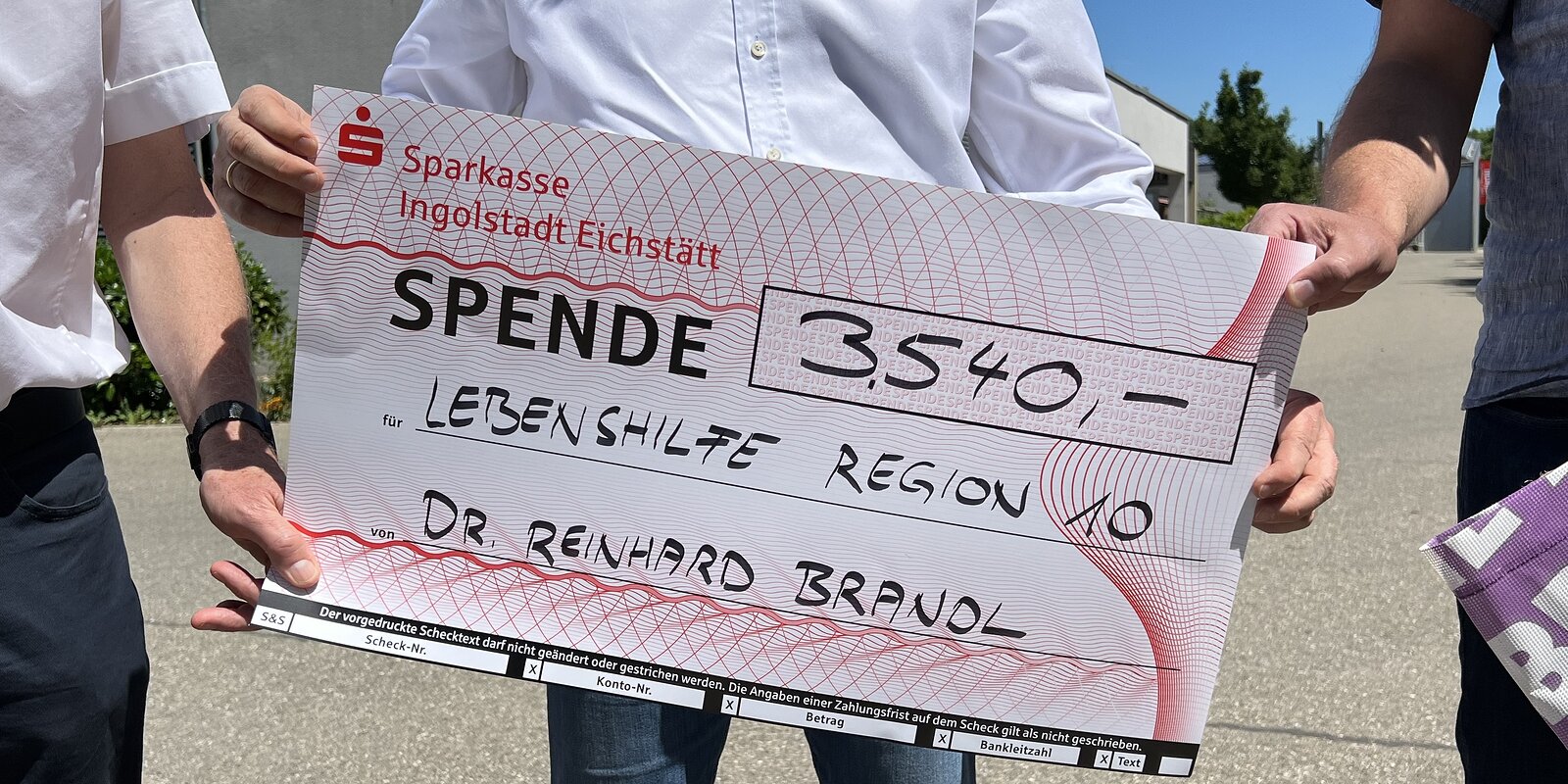 Dreitausendvierhundertfünfzig Euro. Das ist der Betrag, den Dr. Reinhard Brandl der Lebenshilfe der Region 10 mit einem symbolischen Scheck überreichen konnte. Hierzu traf er sich in Neuburg / Donau mit Geschäftsführer Peter Koch und Werkstättenleiter Horst Hornauer.