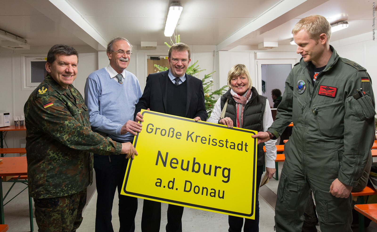 Rund 180 Soldatinnen und Soldaten des Taktischen Luftwaffengeschwaders 74 Neuburg befinden sich derzeit in Estland. Der Einsatz endet im Januar 2017. Nachdem die Soldatinnen und Soldaten über Weihnachten in Estland Dienst tun, war MdB Dr. Reinhard Brandl mit dem Inspekteur der Luftwaffe, Generalleutnant Karl Müllner, zu einem Truppenbesuch aufgebrochen. Reinhard Brandl, Rüdiger Vogt und Sabine Schneider brachten der Truppe als Geschenk ein Ortsschild von Neuburug mit. Oberstleutnant Johannes Durand nahm das Geschenk freudig entgegen und bedankte sich im Namen aller Soldatinnen und Soldaten.