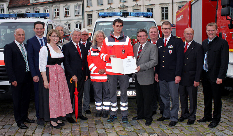 46 Fahrzeuge für den Katastrophenschutz im Freistaat Bayern wurden auf dem Eichstätter Residenzplatz von Innenstaatssekretär Gerhard Eck übergeben. Ein Mannschaftstransportwagen ging an den BRK-Kreisverband Eichstätt und wird in Beilngries stationiert. Für die Anschaffung der Fahrzeuge zahlte der Bund 4,3 Millionen Euro und der Freistaat Bayern 1,5 Millionen. Staatssekretär Gerhard Eck, der den Bayerichen Innenminister Joachim Herrmann vertrat, betonte in seiner Rede, wie wichtig der Staatsregierung die Sicherheit der Bevölkerung ist. Dabei gelte es nicht mehr nur, gegen Unwetterkatastrophen gewappnet zu sein: Bedrohungen wie der internationale Terrorismus stellen die Sicherheitskräfte vor große Herausforderungen. Dafür brauchen die Einsatzkräfte eine entsprechende Ausstattung, so Staatssekretär Eck.