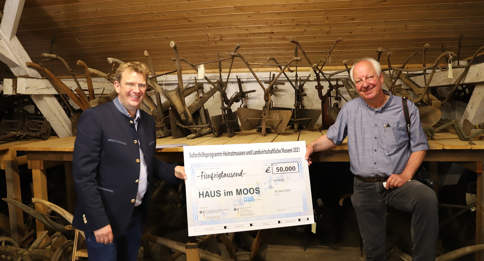 Der Leiter des Freilichtmuseums Haus im Moos, Fritz Koch, freute sich über eine Förderung in Höhe von Fünfzig Tausend Euro aus dem Corona-Soforthilfeprogramm des Bundes für landwirtschaftliche Museen. Der Betrag sei dazu gedacht, dass Museen baulich und digital aufrüsten können, so Reinhard Brandl. Fritz Koch will mit einem Teil der Mittel die Ausstellung im Hofstetter Haus ausbauen und modernisieren. In der Putzei in Karlshuld lagert ein Sammelsurium aus Geräten und Gegenständen. Mit dem Rest des Geldes will Koch diese Gegenstände ordnen und teilweise digitalisieren. In der Putzerei besichtigte Dr. Reinhard Brandl die Schätze die dort lagern. "Es lohnt sich, hier zu investieren" so der Abgeordnete.