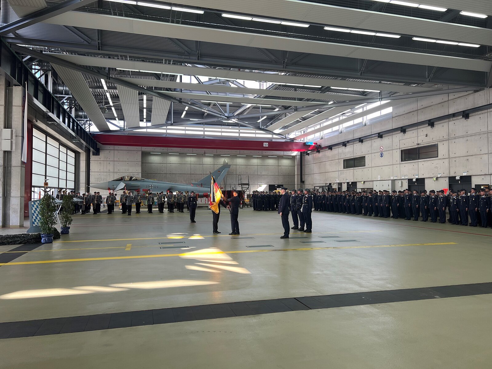 Das militärische Zeremoniell endete nach Bayern- und Deutschlandhymne mit dem Ausmarsch der Ehrenformation und einem Überflug von vier Eurofightern in Formation.