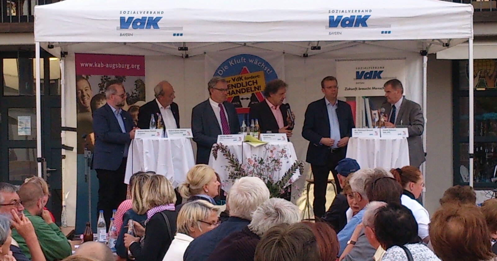 Zu einem Podiumsgespräch hatten der VdK-Kreisverband Neuburg-Schrobenhausen und der KAB-Kreisverband Donau-Paar eingeladen. Auf dem Podium waren die Bundestagsabgeordneten Dr. Reinhard Brandl (CSU) und Ewald Schurer (SPD), die Diakone Klaus Huber und Erwin Helmer sowie Achim Werner vom VdK vertreten. Rund 300 Gäste waren auf dem Schrannenplatz versammelt und konnte Fragen an die Podiumsteilnehmer stellen. Die beiden Bundestagsabgeordneten haben den Appell der Bürger mitgenommen, sich weiter dafür einzusetzen, dass der Mindestlohn sowohl den jungen als auch den alten Menschen ein sorgenfreies Leben ermöglichen muss. Moderator Rudolf Erhard vom Bayerischen Rundfunk bedankte sich bei den Podiumsteilnehmern und bei den Gästen für ihr Kommen.
