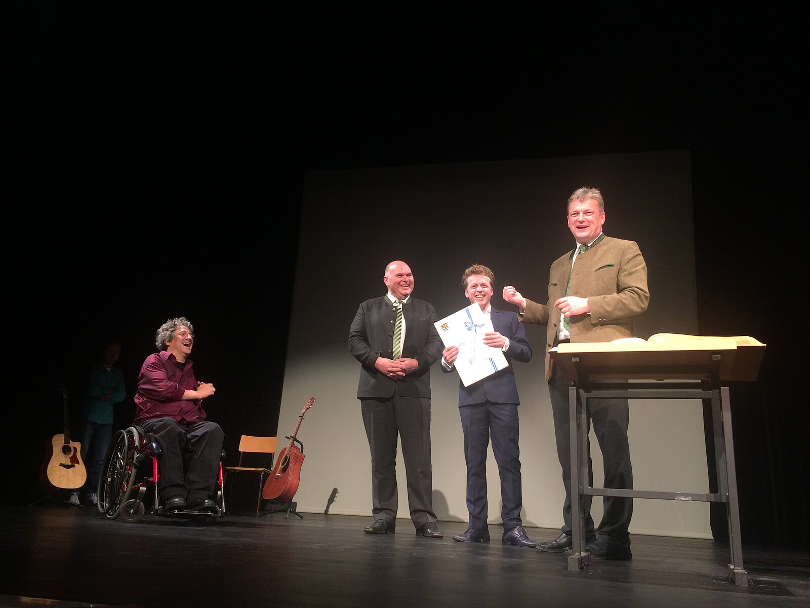 Zum ersten Mal hat der Landkreis Neuburg-Schrobenhausen den Kunstförderpreis verliehen. Erster Preisträger ist der Waidhofener Ferdinand Schmid-Modrow, der sich als Schauspieler bundesweit einen Namen gemacht hat und in zahlreichen Filmen und auch als Bühnenschauspieler immer wieder zu sehen ist. MdB Dr. Reinhard Brandl gratulierte dem jungen Preisträger herzlich und wünschte ihm weiterhin viel Erfolg.